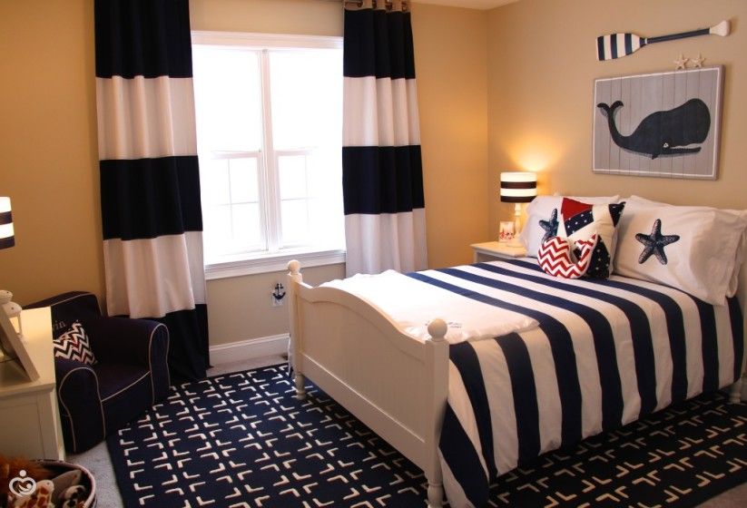 Стала искать… Честно говоря, пришлось просмотреть не одну поисковую страницу, прежде чем найти вариации морского стиля. Первые 3-4 страницы — это такой «очевидный» морской стиль. Первое, что бросается в глаза в оформлении комнат — это темно-синий цвет, бело-синяя полоска и кровать-корабль. И все? И все. Есть, конечно, еще часто используемые элементы декора: якоря, компасы, корзины, штурвалы… Скучновато...