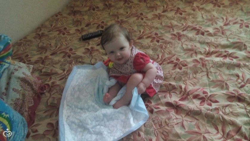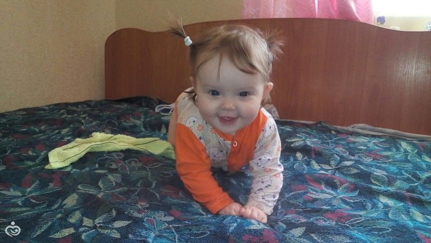 , ползает по пластунски, стоит на четвереньках, качается. Очень улыбчивый ребенок