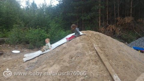 А сейчас обещанная горка). Хотели купить готовую, но прошерстив интернет и увидев цены я срочно передумала. Качели, лесенки, турник, кольца, канат — это вы видели. А горку наш папа будет собирать сам. В проекте она будет совмещена с детским игровым домиком. Но прямо сейчас главнее сделать дровник, вырубить деревья, засыпать хоть часть нового участка и поставить там вагончик (сарай нам нужен). Поэтому горка пока вот такая. Кстати цена ей 9 тыс.!