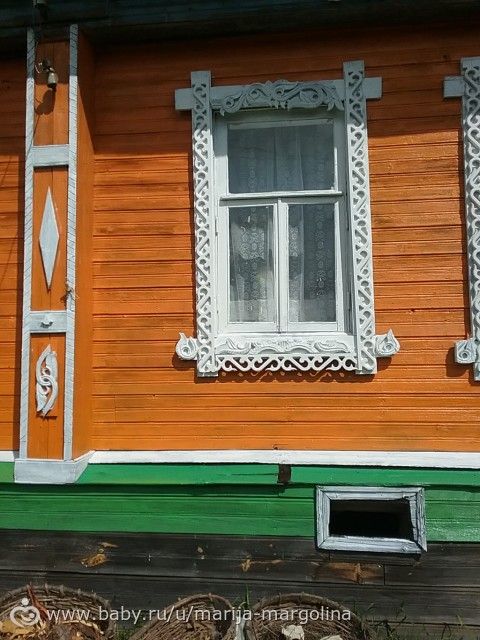 Фасад я тоже покрасила, но фоток его пока нет, они вперспективе.а вот вам пока одно окошечко.Наличники я тоже делала сама.