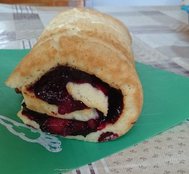 Достать и перевернуть розовой стороной на влажную ткань, снять бумагу. Быстро смазать джемом и свернуть, при помощи ткани… дать немного остыть… Ткань снять… рулет посыпать пудрой..