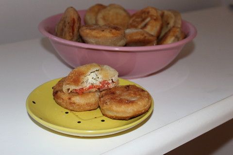 Тесто раскатать на два пласта… тесто — помидор — творог — тесто… и вырезаем кругляшки стаканом) Жарим в масле)