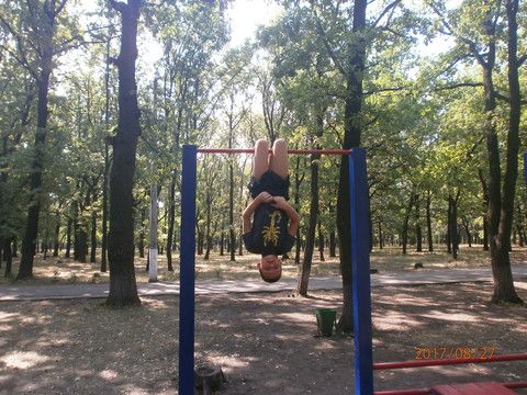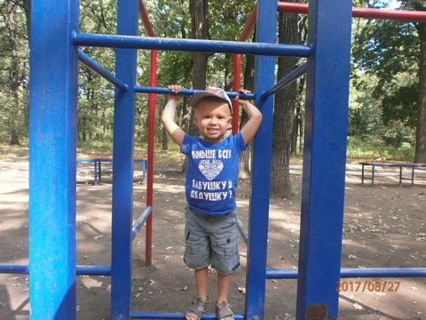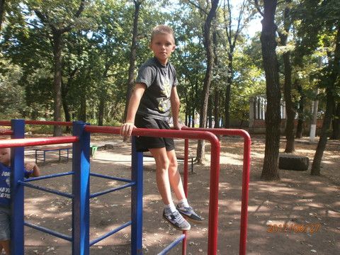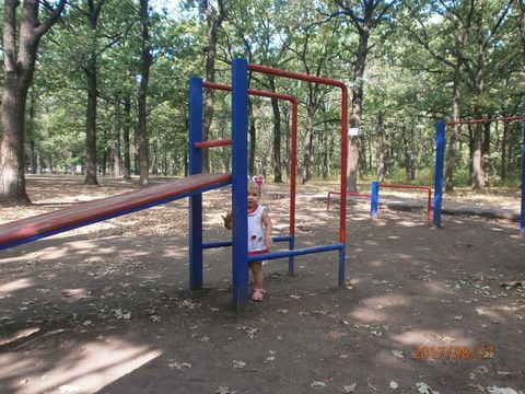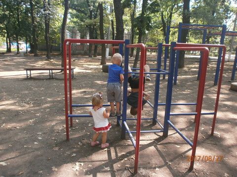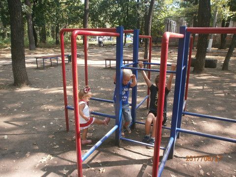 потом мы проходили мимо тренировочной площадки и малышня не смогла пройти мимо турников, Полинка глядя на братиков и себе туда же)))