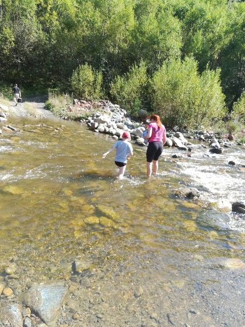 Видите как бодро шагаем. На том берегу решили подкрепиться взятой с дома провизией. Поели и в обратный путь. Сынуль таки не устоял, течение сбило его с ног. Искупался в ледяной горной речке. Благо день был жаркий и было во что переодеться потом.
