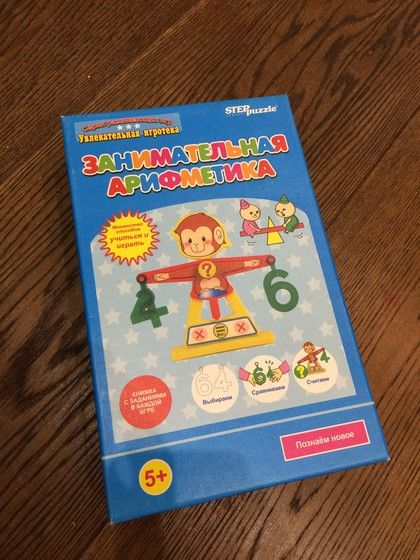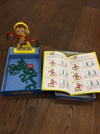 Хотя игра 5+ она у нас давно, и всегда пользовалась популярностью у Эм. Хотя качество самой обезьянки-весов мне не очень нравится, какая-то хлипкая, но Эмму это не смущает, может засесть с игрушкой надолго. Иногда по занятиям, которые находятся в книжке в комплекте, но чаще сама.