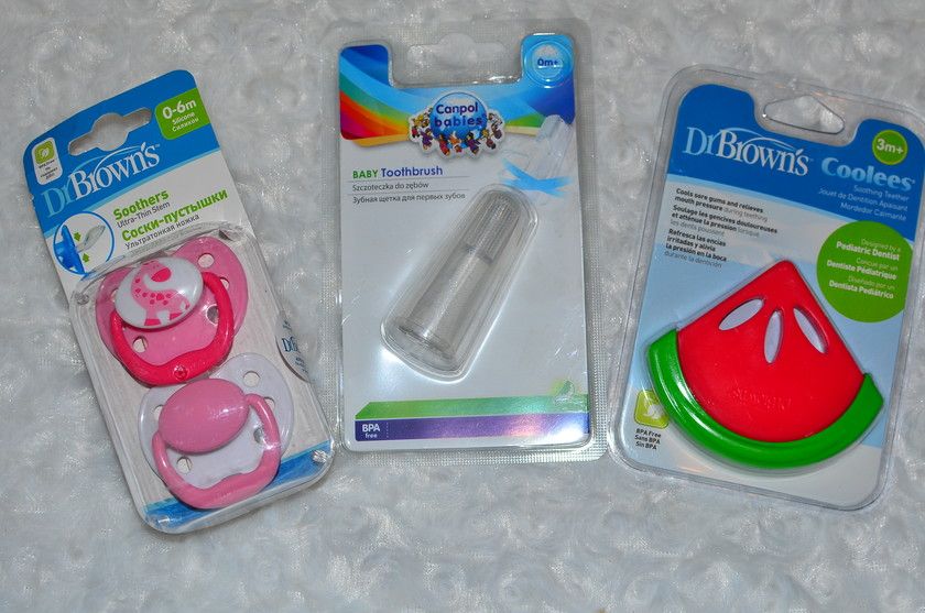 Две соски в контейнере «DrBrowns». На 6-12 мес пока не стала приобретать, воздержалась? а то мало ли резиновая округлость на вставит, а мне потом досасывай? Щёточка для первых зубов и охлаждающая долька арбуза Астраханского?
