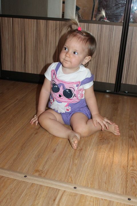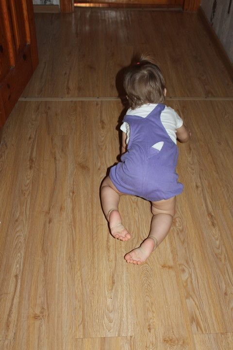 Соня делает первые шаги, но еще совсем мало, в основном ползает и ходит за ручку.