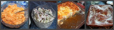 Готовили сегодня запеканку из кабачка и фарша, салат рыжий, салат салями, сметанник на десерт(страшненький получился), домашний лимонад.
