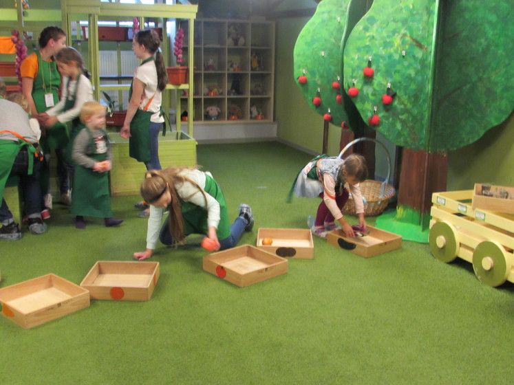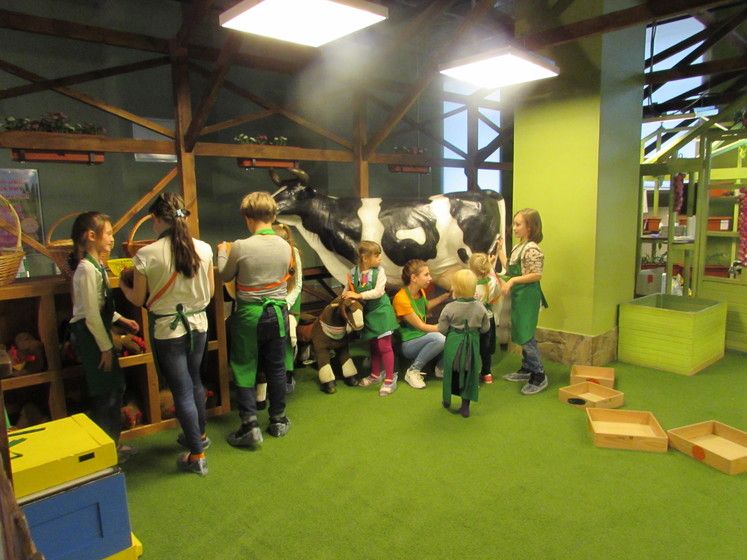 Пошла работать на ферму. Тут дети доили корову, ухаживали за пони, собирали яйца у наседок, сортировали овощи и рвали яблоки.