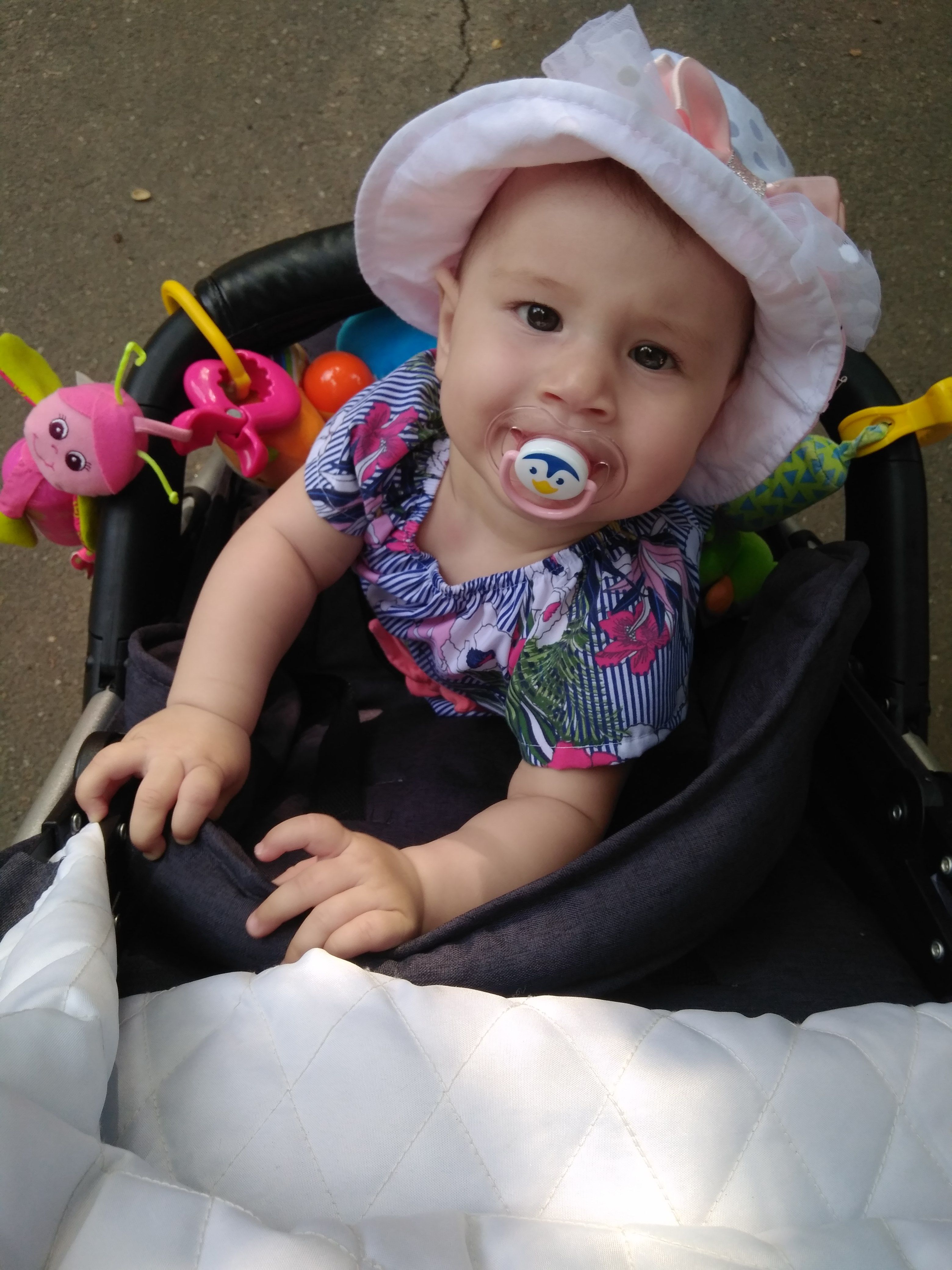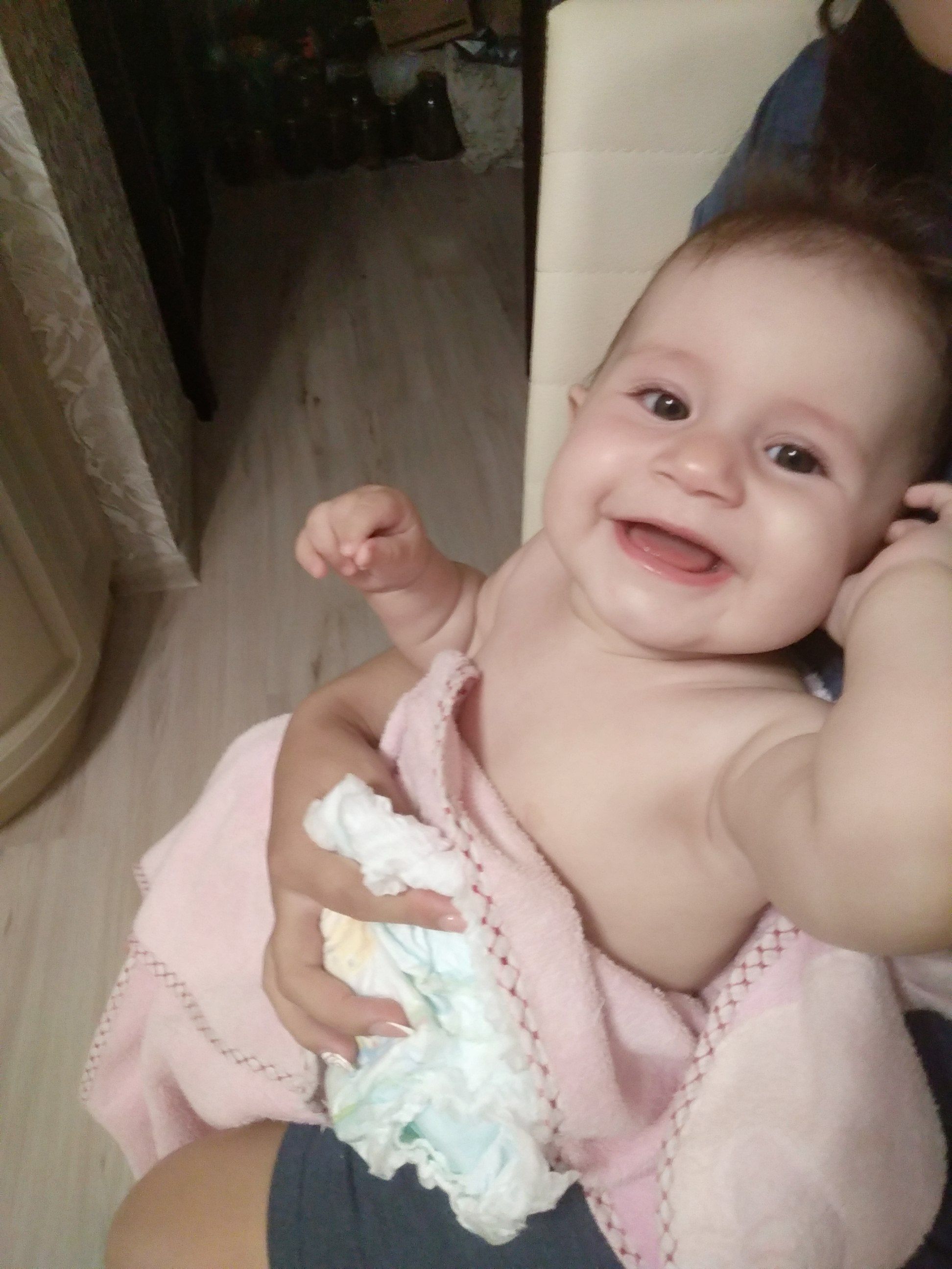 Заметочка для себя, а для вас фоточки))*садится *встает с поддержкой *ходит с поддержкой*тыкает в лицо куклам на вопрос 'где глазки'*любознательная, я уже сделала корзинку всякостей для жевания бытовой дребедени, в которой: тапки, провода, губки, зубная щётка, надувные шарики, слюнявчик, запакованы детские бусы, чуть надорваны чтобы логику включала их достать самой пытается, бумажная коротка от зубной пасты, пластиковая коробка *любит кошек ,(за хвост хватает и шерсть, уже прячутся коты у моей мамы от Наташи)пищит от радости собакам, но лая очень боится -плачет *любит мне в рот засовывать свои пальцы )))*любит книжки и развивающие картинки внимательно смотрит слушает)*не любит когда к ней тянут руки кроме самых близких, плачет при виде людей с чёрными волосами*сама играет в куку(накрывается и открывается, я ей 'ку-ку' ржёт )листает книжки, любит вытаскивать игрушки из сетки, вытаскивать вещи из шкафа, вытаскивать, вытаскивать и вытаскивать ))*умеет разбирать пирамидку, разбирать стаканчики, давить на тугую кнопку на юле, давить на кнопку пищалку на корове, сжимать резиновые игрушки пищалки и свистелки, играет в мяч(кидает хоть и криво ), игрушку лялю обнимает и убаюкивает(говорит а-а-а), разбирает конструкторы, нажимает на кнопки, пианино, гитарки, танцует под мелодии, смотрит мультики на массаже, играет в 'умную погремушку' на телефоне или планшете, играть пальцем на своей губе, плещется в воде с игрушками при купанииК новым игрушкам привыкает только через 2-4 дня, а так боязно реагирует, особенно на говорящие и музыкальные.Слова: мама (чётко), мяу и гав (не чётко, но по интонации я понимаю *своего папу и мою маму встречает с бурными овациями и радостью, бывает провожает плачем, иногда машет сама в ответ 'пока' В новой обстановке, в гостях адаптация мин 10-20, в руки ничего не берет смотрит на всех изучающе и скептицизмом, улыбается только маме, папе, бабушкам *смеется от активных игр, танцев в обнимку, когда получаются новые навыки, когда я хвалю или забыла похвалить а обычно хвалю за какое то действие навыков, показывает смехом чтобы я ахнула)) смеётся от козы рогатой, от кусания мной ее ступни, или бока, от пряток в занавесках восхищённо смеётся с таким прям ах) *сама ест кусковую пищи, варёное мяско, овощи Вроде все, перечислила ))