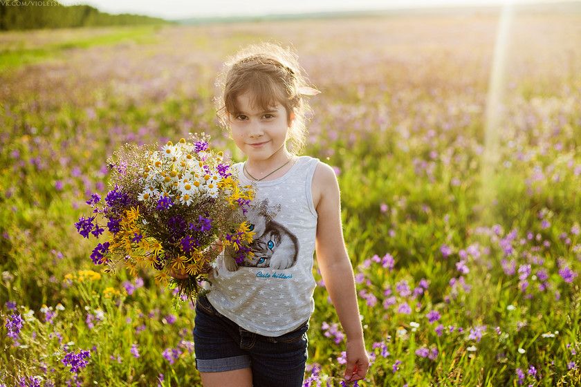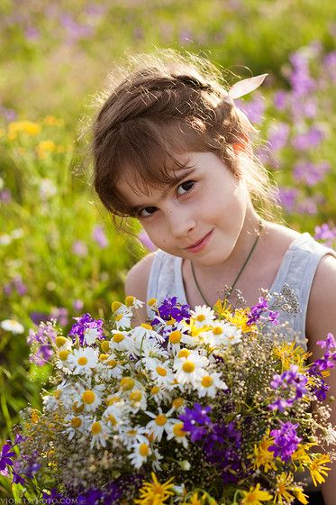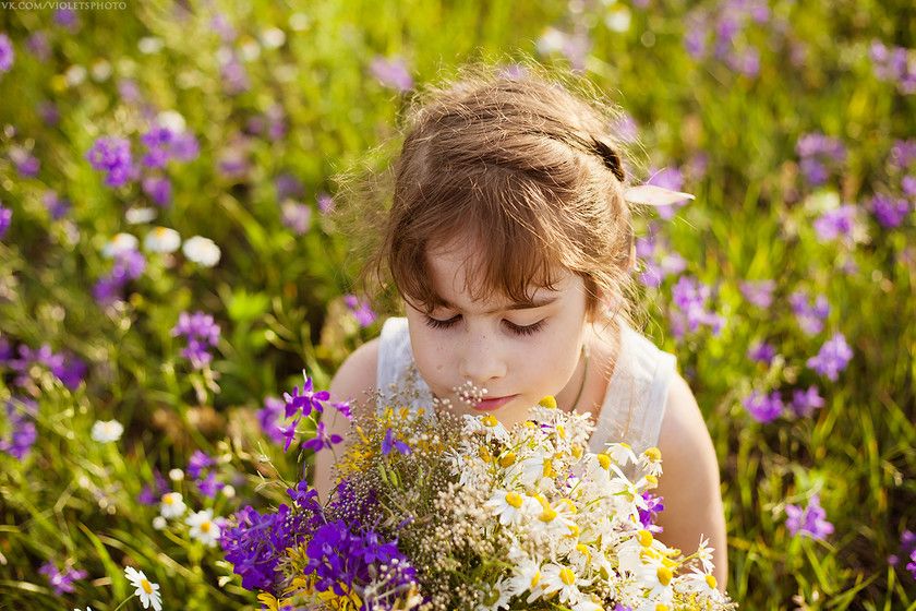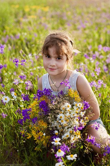 … На это поле дивной красоты мы набрели (наехали?), когда ездили проведывать Даню в лагере. Вечерело, удалось сделать всего несколько кадров, но я рада, что в моей копилочке теперь есть и такие). Итак, Катя, ромашки и все остальные цветы).