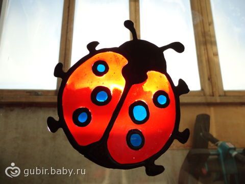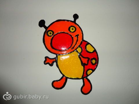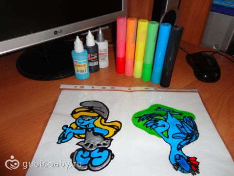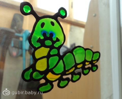 Обводим контуром по картинке (прямо с баночки выдавливаем краску), через часов 6 (мы на следующий день) закрашиваем внутри контура (главное пустого места не оставлять). После высыхания (тоже день даём подсохнуть) снимаем аккуратно с файла и приклеиваем сразу на стекло (или другую гладкую поверхность).
