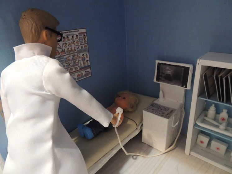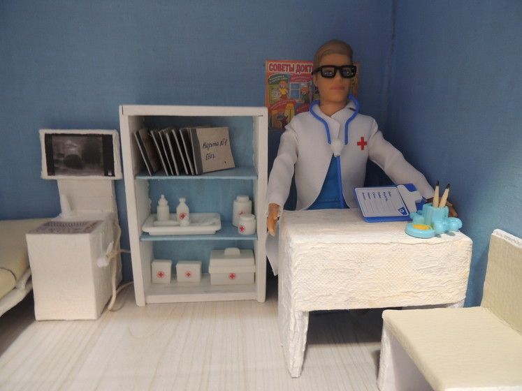 Основа — коробка из гофрокартона, плюс пара слоев гофрокартона еще для укрепления. Стены оклеены внутри голубой тканью, нашлась в закромах типа больничного лоскута простыни большой. Стеллаж для мед.карт и лекарств — деревянная коробочка была от чего-то, вставила полочки, окрасила все в тон кабинета. Кушетка кожаная — основа гофрокартон толстый в два слоя, потом поролон, обтянутый кожзамом (лоскуток был). Аппарат УЗИ из картонных коробок укрепленный, оклеенный салфетками и задекупаженный. Ну и картинки монитора и клавиатуры. Ростомер на стене, весы из коробка от спичек, тоже наклейка весов с принтера. Ну и стол и стул врача, и стул пациента. Полы оклеила пленкой под дерево, оставшейся от кукольного домика еще. Саму коробку оклеила оберточной бумагой из закромов. Главное что коробку можно поставить в шкаф, накрыв крышкой (для коробки крышку только осталось доделать) и можно хранить даже игрухи какие-то, ну или саму мебель из больницы и куклу врача, а когда нужно, доставать играть.