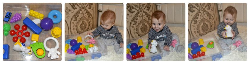 Сложи в корзину. 9 месяцев – отличный возраст для приучения к порядку, не правда ли? Давайте вместе с ребенком соберем кубики или детали первого малышкового конструктора и сделаем это в форме веселой и, конечно, развивающей игры.Для начала будем просто учиться бросать кубики в корзину или ящик для игрушек. Постепенно усложним задачу и введем элементы классификации предметов – будем складывать кубики в ящик, а конструктор в коробку или красные кубики в одну корзину, а синие в другую. Также можно собирать игрушки на скорость (не забывайте иногда поддаваться), соревноваться в меткости броска в корзину и т.д.