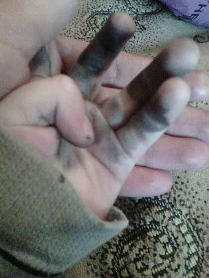А фотка сделана месяц назад. Когда папа утром забыл спрятать спрей для обуви. Слава Богу, кроме ладошки и рукавов бодика, не пострадало ничего.