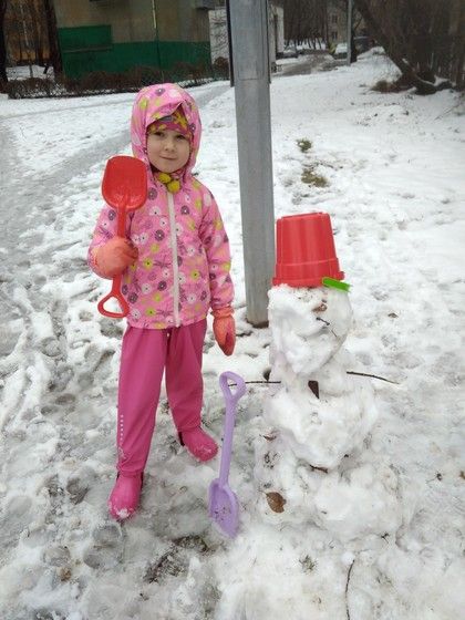 А на следующий день дочь играла со снегом на улице. Снеговик не наш. Наше только ведро и лопаты.