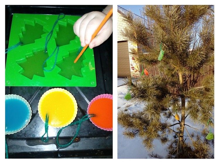 Второе задание посвящено льду. Делали с Арсюшей фигурки из цветного льда, украшали ими деревья, правда,украшали деревья мы с Гришей на прогулке, так как Арсений был в садике.