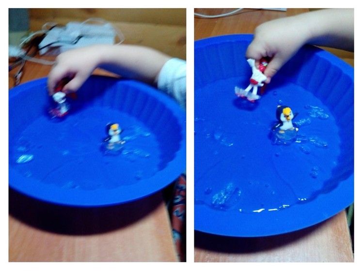 Поиграли в игру „Каток“. Пока сынок был в садике, все подготовила для игры: заморозила сам „каток“ в форме для выпечки, сделала ледяное основание игрушкам, чтобы лучше катались. Вернувшись, Арсюша с удовольствием играл, пока лед совсем не растаял.