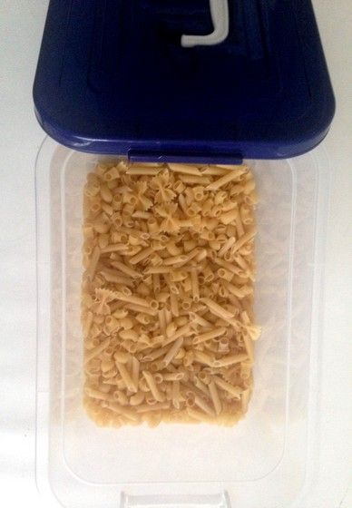 5. Емкость с макаронами (или любым другим сыпучим наполнением). Это просто хит уже 2й месяц! Только дай ящик — научился сам крышку открывать, сидит и перебирает их. Конечно, потом собирать по полу, но ребенка занять можно, когда очень надо. Можно купить большие каннелони.