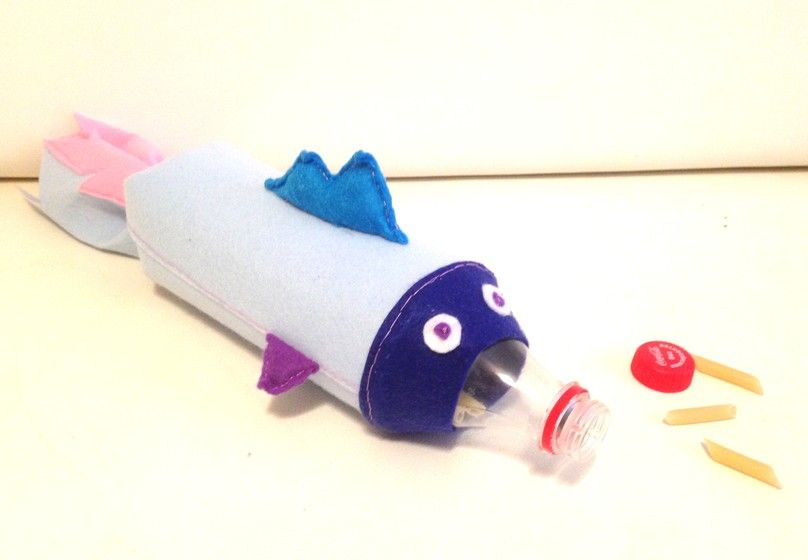 2. Рыба- проглот. Сшили из фетра (можно из ткани) чехол на бутылку. Рот открываем и кормим рыбку макаронами: координация, точность и усилие)