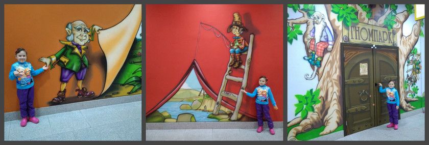 В этот день было пасмурно и дождливо. И мы вместе с Леной и Верочкой отправились в ТРЦ «Седьмое небо» в «ГномПарк». ГномПарк — это аналог нашей Замании и т.п. У Лены был купон на 1 час, а я оплатила 2 часа, т.к. 2 сразу дешевле, чем 1+1. Вообще там дорого. Один час — 300 рублей. Два часа — 500 рублей. Три часа — 600 рублей. У нас в «Замании» в будни за 500 рублей можно целый день скакать. А там и скакать-то столько времени негде. Нет, вообще-то парк хороший. Но больше часа там делать нечего.