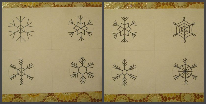 Задание от ДМ — сделать 8 снежинок. Снежинки на этот раз я решила попробовать сделать из клея ПВА. Нарисовала несложные схемы. 4 попроще, 4 чуть посложнее.