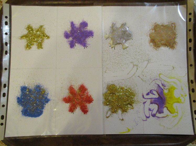 Рисовать клеем не очень получилось ни у Иры, ни у меня. Если мало лить, полоски расходятся, получаются пробелы, а все линии должны быть соединены. Если много, то полосы сливаются в капли. В общем сделали, как смогли. Сразу посыпали блестками и цветным песком. Завтра будем смотреть что получилось.