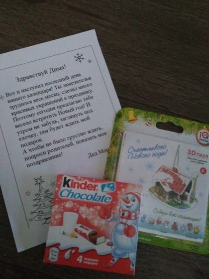 Дима только проснулся побежал проверять мешок, там он нашел письмо, шоколад и 3D-пазл.
