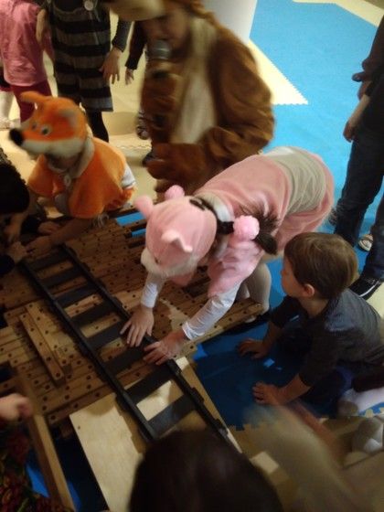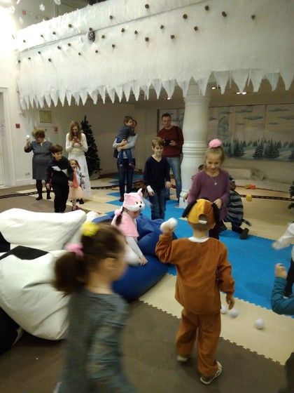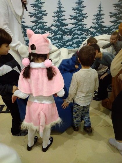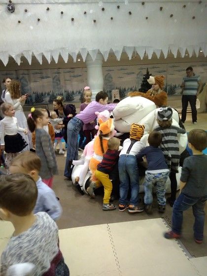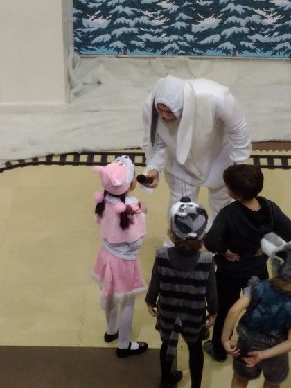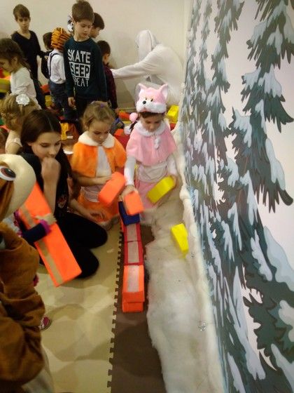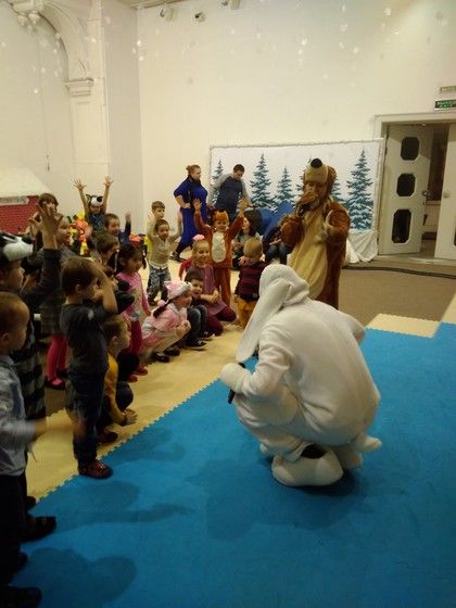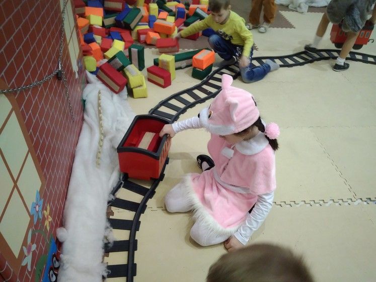 Внизу сначала все познакомились. Потом всё таки нашли медведя, который ждал поезд дедушки Мороза и проверял железную дорогу. Заяц с детьми естественно присоединились к нему. В процессе где-то развлекались, где-то трудились.