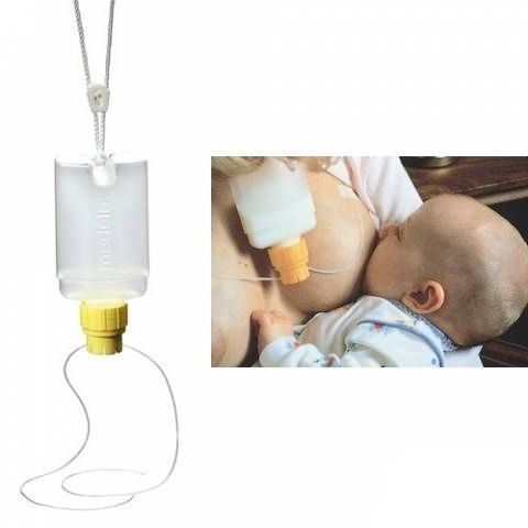 Дополнительная система кормления представляет собой резервуар, который заполняется дополнительным питанием. Его можно размещать на груди у мамы или на штативе. Очень тонкие гибкие трубочки закрепляются у сосков мамы и подают дополнительное молоко и питательные вещества во время кормления ребенка.
