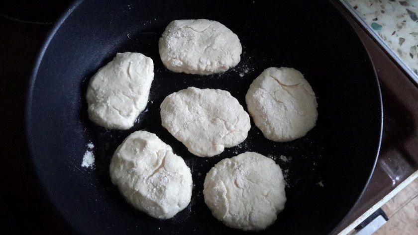 На горячую сковороду на масло кладу лепешки и выключаю плитку, все дальше на маленьком нагреве