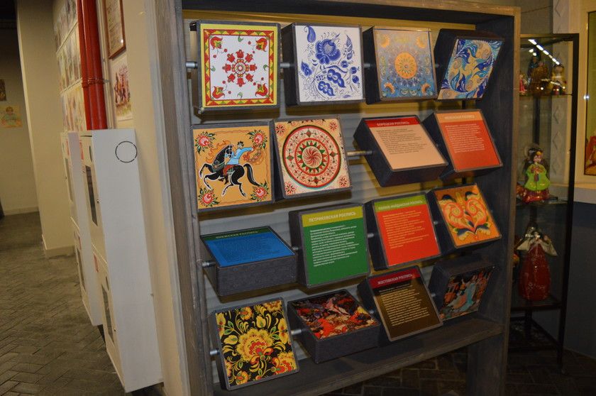 И интересный стенд с разными видами росписи, перевернув которую можно было про неё прочесть.
