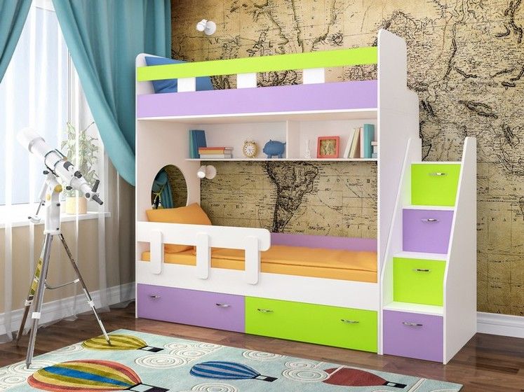Это от детей зависит. По идее на 2 ярусе должен спать старший, но у меня, например, дочь до сих пор боится… уже подумываю о выдвижных кроватях… ну а младшего внизу, думаю, уже с 1,5 лет можно положить, раньше бы побоялась