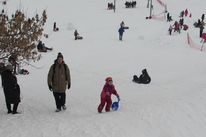 Аня хотела на санях, но мне стоять с детьми в очереди еще полчаса совсем не хотелось. Мы пошли на горку. Тут было платное катание на тюбингах и бесплатное на своем инвентаре.