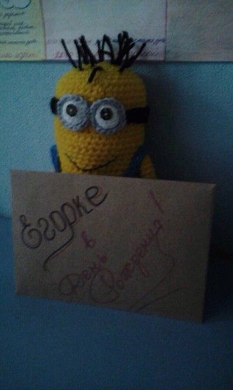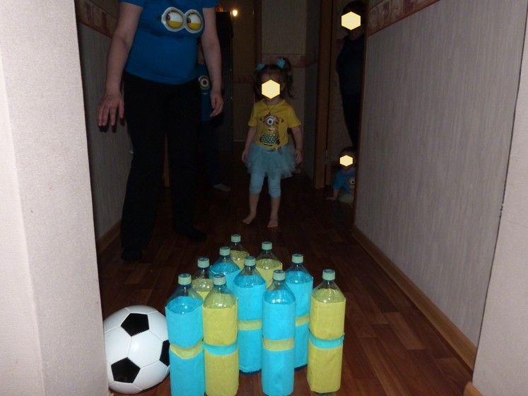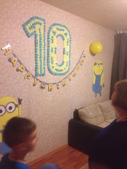 Все получилось у нас рукотворное: большие миньоны в большей степени нарисовала мама имениника, маленькие миньоны (весели по всей квартире), миньоны из киндеров (раскрашивала лаком для ногтей), кубики, дом из конструктора, газета с подсказками, музыка, видео, мультики (все из инета скачала)