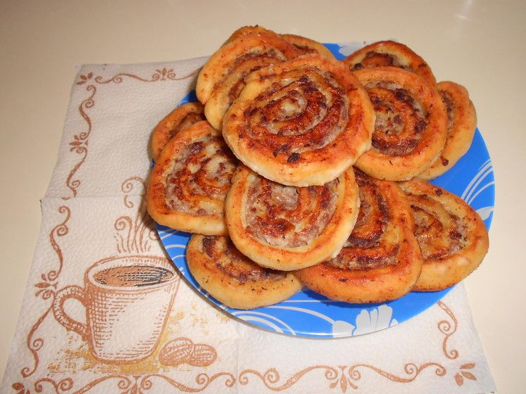 Шанежки с мясом! Для теста: 250гр.творога, 2 яйца, 1 ч.л. соды, гашенной уксусом, 2 ч.л. растит. масла, 2 стак. муки, возможно чуть больше муки, если творог очень влажный. все перемешать,(тесто должно получиться упругим и не прилипать к рукам), раскатать овал толщиной не больше 5мм, тонким слоем выложиь фарш, приправленный солью, специями и репч.луком, сверху немного присыпать сыром (не обязательно), свернуть рулетом, порезать на кусочки толщиной 1см и обжарить в большом количестве масла на несильном огне! Все делается быстро и просто, получаются всегда:)