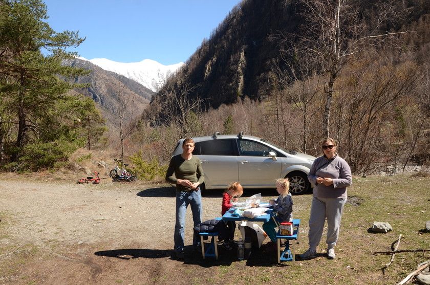 И наконец-то обед.Столик мы с собой взяли раскладной.Но есть там и столы для пикников деревянные, просто они под деревьями в тени, а там прохладно, нам хотелось на солнышке.