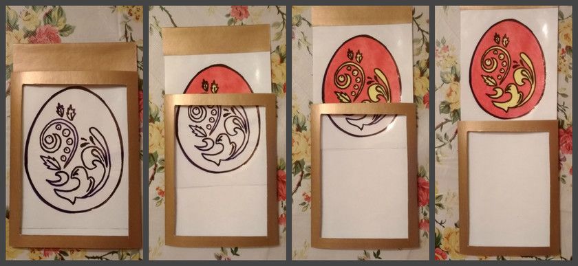 Ещё я ей сделала новое яйцо в открытку-фокус, учитывая все недочёты. Первое пасхальное яйцо должно быть красным. И на открытке-фокусе должен быть контур рисунка.