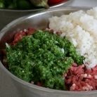 2. Теперь до полуготовности отварим круглый рис, воду сольем, а рис промоем в холодной воде. Мелко нарежем луковицу и немного кинзы (можно воспользоваться блендером). Все это добавим к мясу.