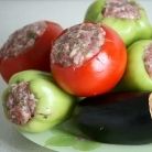4. Теперь займемся овощами. Верхушки перцев отрезаем, внутренности вынимаем, так же очищаем от внутренностей баклажаны, вырезаем у помидоров верхушки, и чайной ложкой аккуратно вычищаем серединку (выбрасывать мякоть не надо, а выложим в мисочку). Овощи плотно и аккуратно фаршируем.