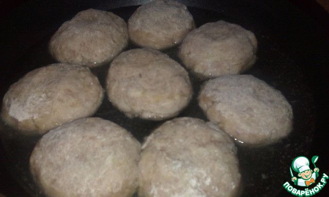 Сформовать голубцы, как средние котлеты и обвалять в муке. В сковородку налить немного растительного масла, выложить голубцы, залить горячей водой до середины голубцов, поставить на очень маленький огонь и накрыть крышкой. Томить пока не выпарится почти вся вода, а голубцы снизу начнут немного подрумяниваться.