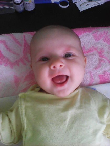 Всем привееееет!!!))))) Наконец-то я решилась тут написать хоть что-то после родов)))) Прошло уже 4 месяца, я захожу сюда регулярно, но посты писать как-то некогда что ли было или просто лень))))) забот и хлопот много))) только возьмешься за что-то, тут же дочка как чувствует-надо к ней бежать))) В общем, нам послезавтра 4 месяца стукнет)))) моя лапочка-дочка растет, еще не взвешивались в поликлинике, но дома примерно взвесились-6кг где-то. Головку держит, агукает, лялякает, акает, все что можно говорит))))) пока не переворачивается, но я очень жду со дня на день))) глазки у нашей детки папины, серо-зеленые, а так говорят, что на меня похожа)) хотя сначала говорили, что вся в папу))) не знаю я сама, не понимаю))) ходим гулять каждый день, по 1.5-2 часа дышим. Очень любит свое отражение в зеркале, смеется в голос, как взрослая, когда начинаю с ней в отражении играть)))) Режим установлен, не строгий, но есть уже. С утра подъем в 6-7, по-разному бывает. Покушаем, погуляем и спать в 8 до 9. Потом спим в 11 до 12. Я очень рада, что доча начала спать хорошо, а то минту по 15 спала, невозможно ничего сделать, нервы… А сейчас час спокойно может проспать) спим в кроватке. Иногда утром часов в 5 могу ее с собой положить, но это редко.Приучила ее к кроватке все-таки))) В 15 до 17 где-то прогулка, потом в 18.30-19.00 сон перед ванной)) Купаемся в 20.30, чтобы в 21 уже ее уложить)) ну сейчас лето наступит, будет светло, переведу ее на попозже))) Пока так)) Десна нижние опухли, доча кулачки уже чешет об них, наверно скоро зубоньки полезут))) Сама не засыпает, что расстраивает меня. Прочтешь тут у кого-нибудь: ребенок сам в кроватке засыпает… У нас это просто нереально, только с укачиванием на фитболе.Доченьку свою безумно люблю, как до нее жила-не знаю… Зацеловываю ее прям не могу))))) а она смеется))))) и когда укачиваю в ночь, пою ей песенки, а она на меня смотрит счастливыми глазками… вот опять заревела сижу))))) так трогательно это… Смотрит такими глазками и подпевать начинает-кууууу… гуууу...)))))) и я плачу сразу))))) Счастье мое неземное)))))))))А, покрестили нашу малышечку 21го апреля))))