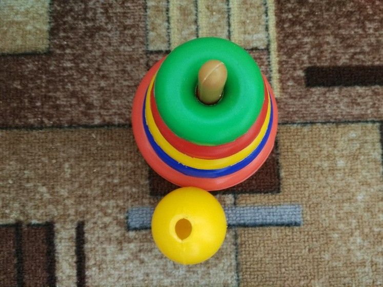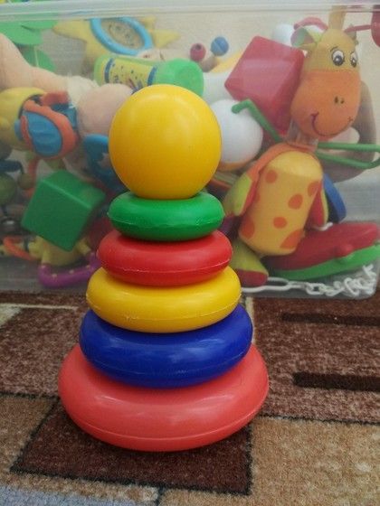 Пирамидка простенькая, яркая, малышу удобно держать в руке колечки. Единственное, что меня смущает, — это шарик. Теоретически в дырочке может застрять пальчик, она не очень аккуратно сделана.