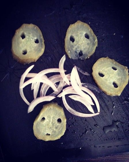 как бы вы назвали эту гастрономическую инсталляцию? Моя версия — «огурцы осуждают лук за то, что он такой не собранный».