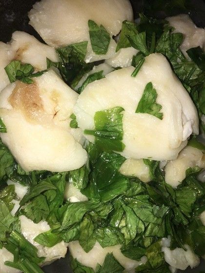 Хорошенько промоем щёчки. На сковороде раскалим оливковое масло и слегка обжарим чеснок. Обжариваем не до потемнения чеснока, а до появления аромата. Чеснок уберём и выложим в сковороду треску. Обжариваем на сильном огне, быстро! Если передержите — щёчки уже не будут такими нежными. Обжарив минут 7 щёчки, добавим порезанную петрушку и две соловые ложки воды. Потушим ещё минут 5-7. Всё готово!