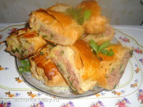 ооочень просто, на раскатанное слоеное тесто слоями растолченную отваренную картошечку+обжаренный в раст. масле фарш с лучком, сворачиваете в рулет, обмазываете яичком и в духовку на 30-40 мин на 200гр