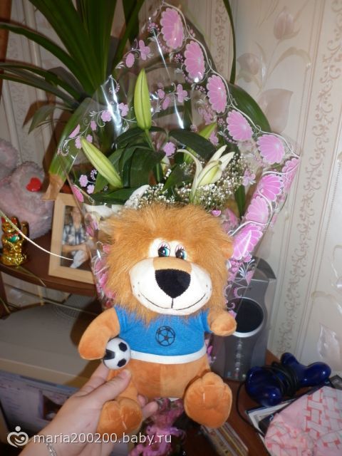 Год назад он только родился, а сегодня уже год. Как быстро летит время. У нас уже 5 зубов. :) Папа с утра нас поздравил, маме букет лилий, а Сашульке львенка маленького. :)