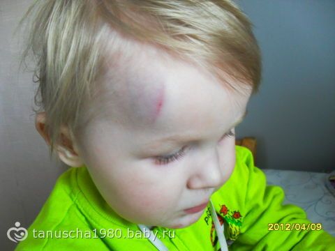 Сейчас как обычно везде лазеет, хулиганит и играет. вроде как обычно. На фото шишка с ссадиной после поездки в бол-цу.