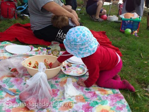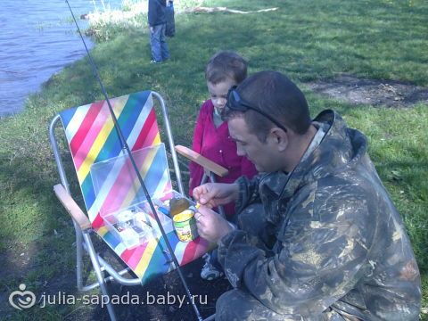 Папа насаживает наживку)))) Только это бесполезно, мы ему сразу сказали, что рыбы здесь не будет, с таким количеством детей)))
