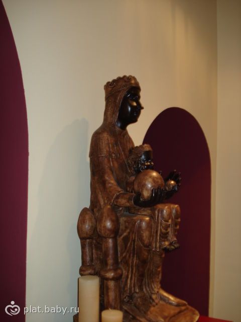 Так выглядит сама Чёрная Мадонна.Она в нарядах и украшениях, что принесли для неё цыгане.Рядом с ней ящик с записочками.Есть несколько версий происхождения этой святой.Одни считают, что она была египтянкой, другие, что королевой и третьи, что языческой богиней.Большинство склоняются к третьей версии, потому она и стоит в подземелье церкви.Эту статую нашёл местный мальчик.Она настолько древняя, чтовосходит к кельтским языческим временам, а значит, она вполне может быть Чёрной Мадонной, которой поклонялись в язычестве.Только Чёрная-это не значит, что плохая, подземная, вредная, Чёрная только из-за цвета.